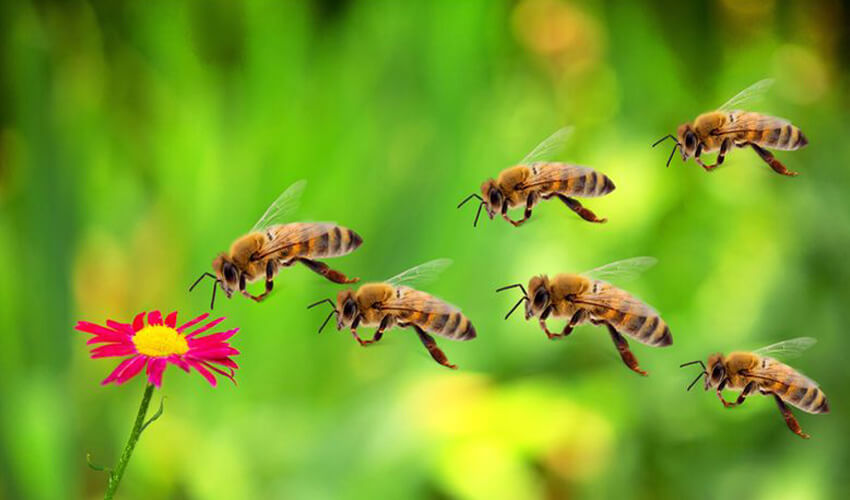 De bijen vonden samen een bloem en danken de bloem voor de lekkere nectar die ze krijgen om honing -hun voedsel- van te maken.
