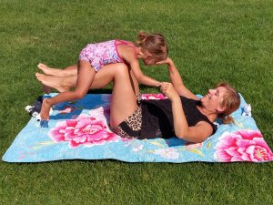 De ouder probeert zijn/haar benen volledig te strekken en het kind ligt horizontaal met de buik op de voeten van de ouder.