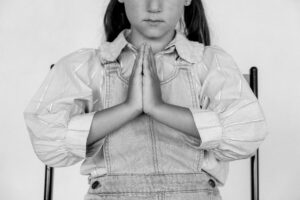 Ze brengen de handen tegen elkaar voor het hart met gesloten ogen.